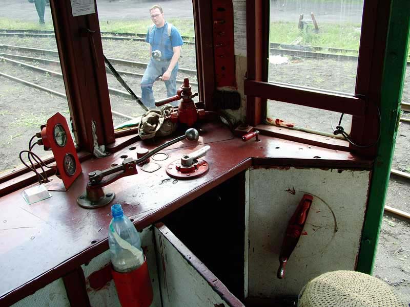 Blick auf den Führerstand auf der Plattform ohne Motor. In der Plasteflasche befindet sich übrigens Sand zum Sanden.